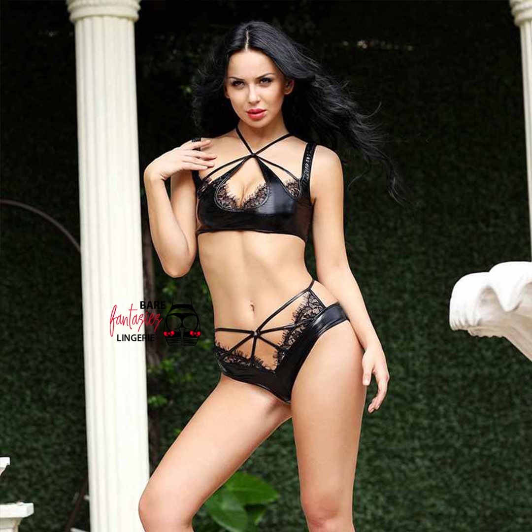 This cage strap bra and panty lingerie in all black gives you an irresistible seductive look. The strap detail nods to bondage while the sensual vinyl fabric gives this set a beautiful sheen. O-ring accents add devilish detail to this naughty set and the matching panty promises a coordinated after-hours look. Wanna seduce your lover with something exceptionally stunning? Here you are! This set is a perfect choice. Just look at it!